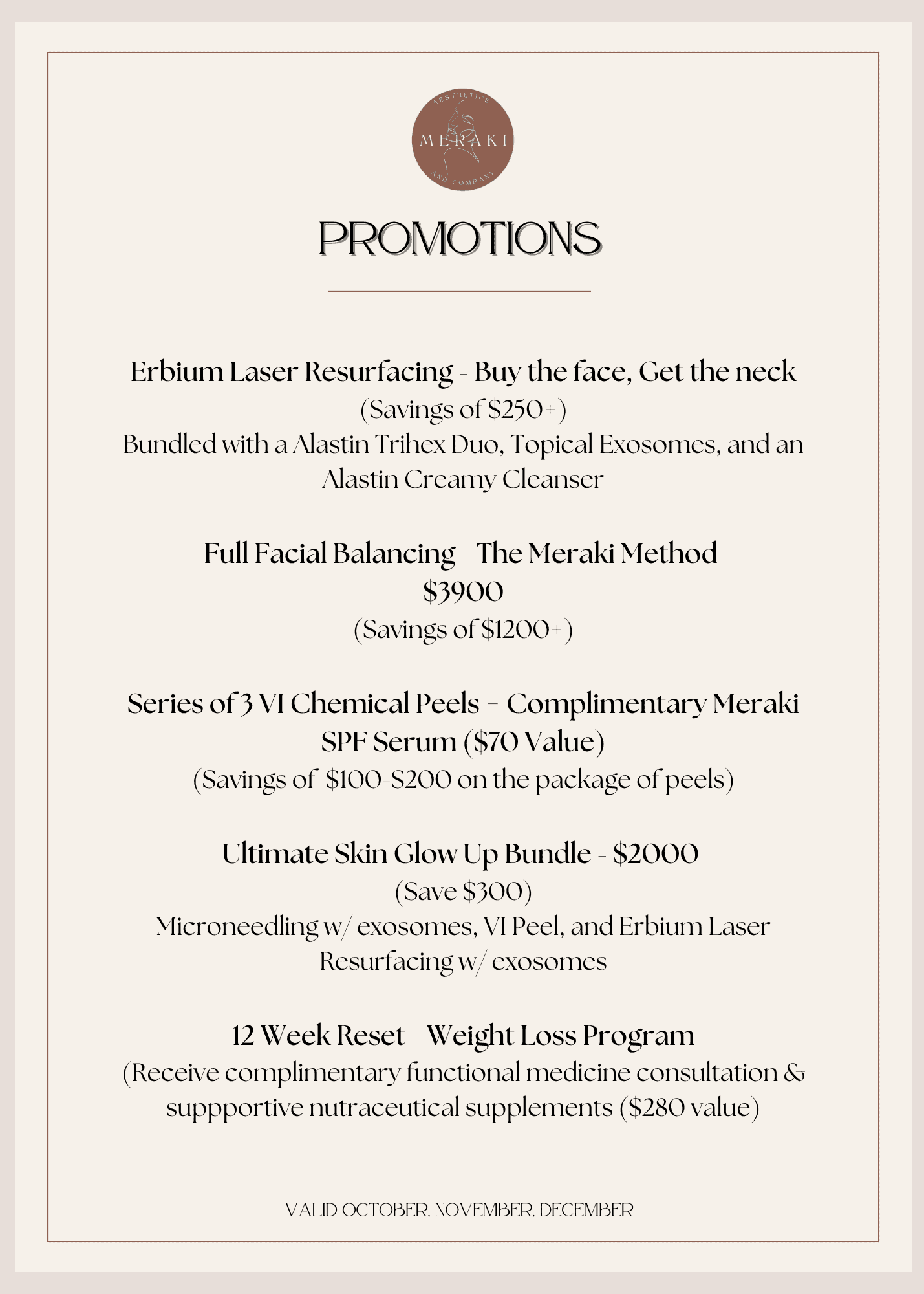 Meraki Aesthetics and Company is a modern medical spa and functional wellness practice where advanced aesthetics and integrative medicine come together. We specialize in anti-aging, facial rejuvenation, and whole-body wellness, offering the highest quality care through evidence-based treatments and personalized programs.